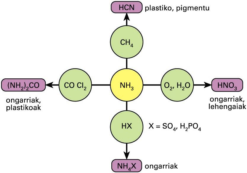 - NH3 formulako konposatua. Gas kolorgea da, usain bortitzekoa eta begiak narritatzen dituena. Nitrogenoaren zikloko konposatu garrantzitsua da. Petroliotik, gas naturaletik edo sintesiz lortzen da. Industria kimikoan erabiltzen da, bereziki azido nitrikoa eta ongarriak ekoizteko.