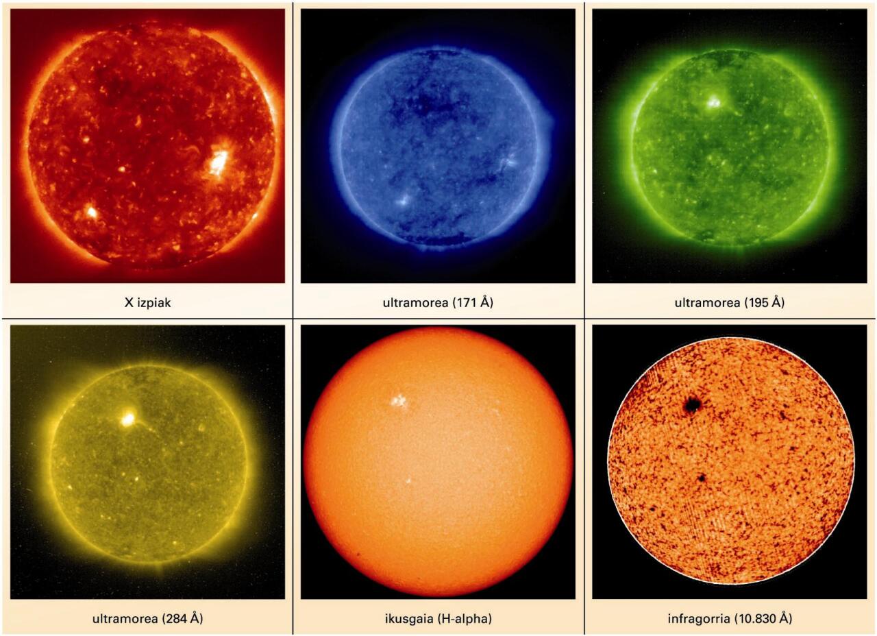 Eguzkiaren argazkiak, zenbait uhin-luzeratan hartuak (kolore faltsutan) (iturria: SADC-NASA; argi ikusgaian egindako argazkiarena: Big Bear Solar Observatory)