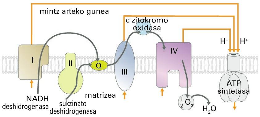 • IV KONPLEXUA (c zitokromo oxidasa): C zitokromo erreduzituaren elektroiak jaso, eta O2-ari ematen dizkio; hala, H2O sortzen da. Urrats honetan lau protoi igarotzen dira mintzen arteko gunera.
