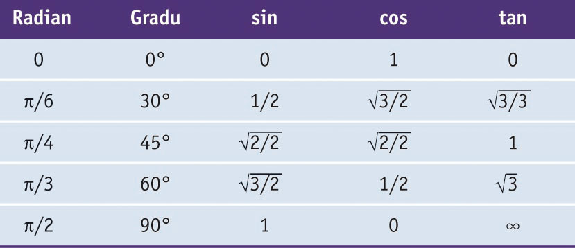 Urte askoan zehar, funtzio trigonometrikoen balioen taulak oso erabilgarri gertatu ziren kalkulagailu eta ordenagailuen agerpenak taula horiek zaharkituta utzi zituen arte. Hona hemen zenbait angelu garrantzitsuren arrazoi trigonometrikoen balioak: